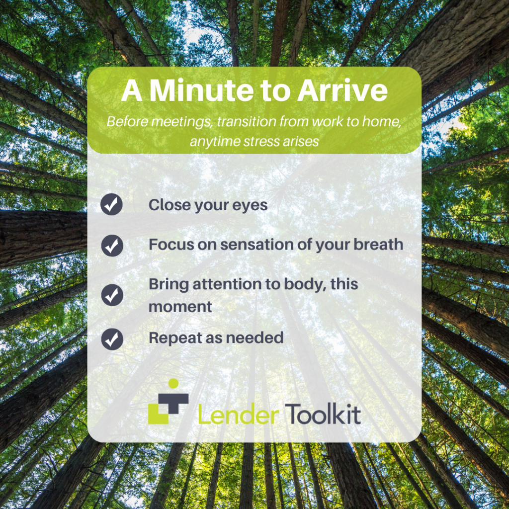 Did you know, “Mindfulness meditation is a staple of employee development in several Fortune 500 organizations including General Mills, Goldman Sachs, Google, Apple, and Nike,” (Levin, 2017)? More and more leading companies are following in their footsteps, because, “Consistently, mindfulness has been shown to serve as a method of relieving employee stress and encouraging increased productivity,” (Levin, 2017). This is why mindfulness is one of the core elements of Lender Toolkit’s new Wellness Roadmap. We believe in empowering our team members with tools to live better lives, and the data on mindfulness is indisputable. So give “A Minute to Arrive” a try, and see just how simple, yet effective, mindfulness can be in your work life, and personal life.